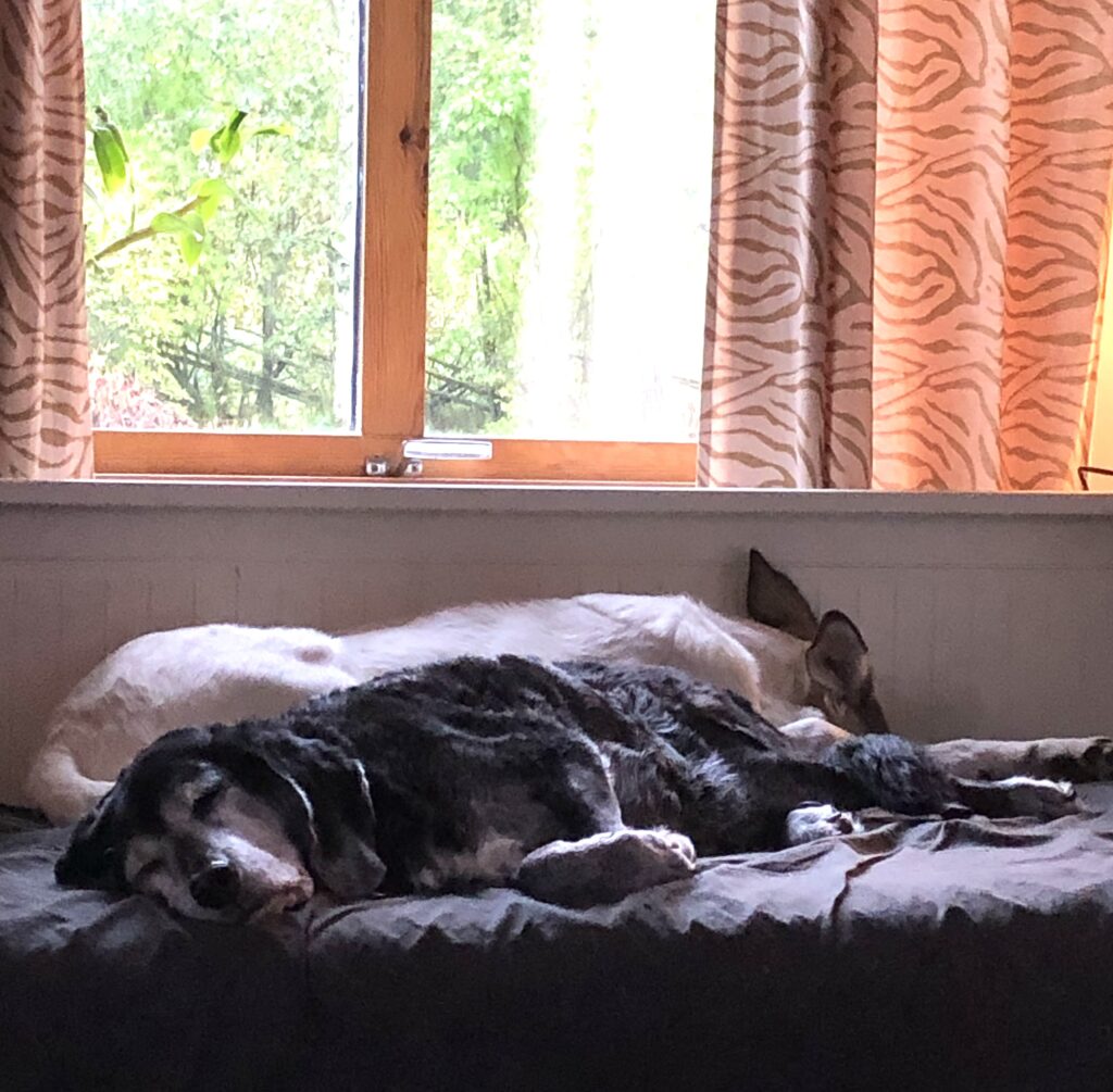 Idag blev det bättre väder nu på eftermiddagen och vi kunde vara ute i trädgården en stund. Hundarna saknar Mats och känner av mitt lite rastlösa humör och söker sig till varandra.