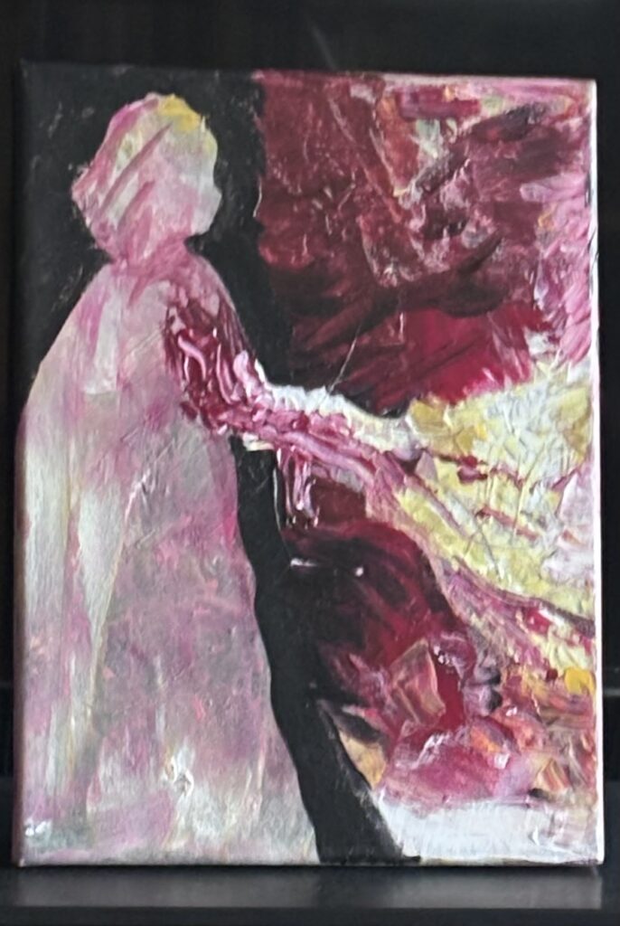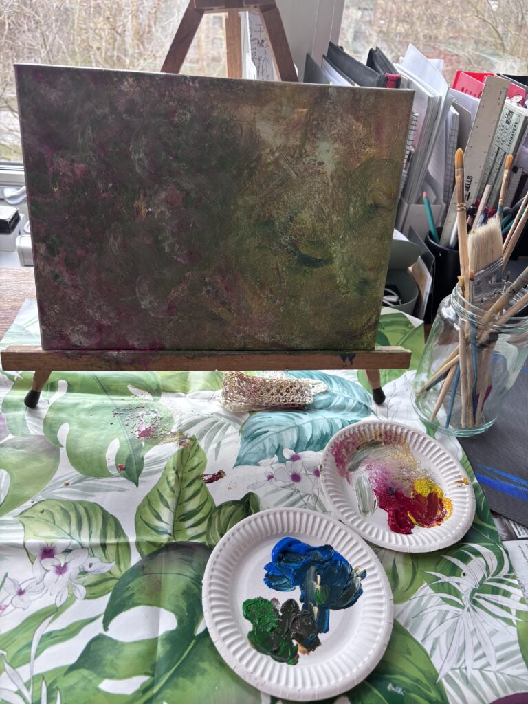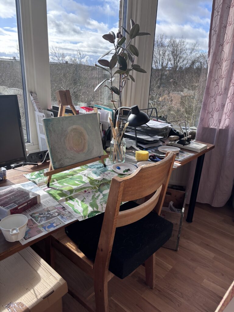 Igår hade jag en bättre dag. Jag plockade äntligen fram mina akrylfärger och började måla. Långsamt, långsamt växer, nästan värker, en bild fram. Att måla är en bra del i läkningsprocessen för min del, jag skildrar den del av sorgeprocessen som är att släppa taget! Det återstår mycket arbete med målningen, jag har ingen aning om hur den blir till slut.