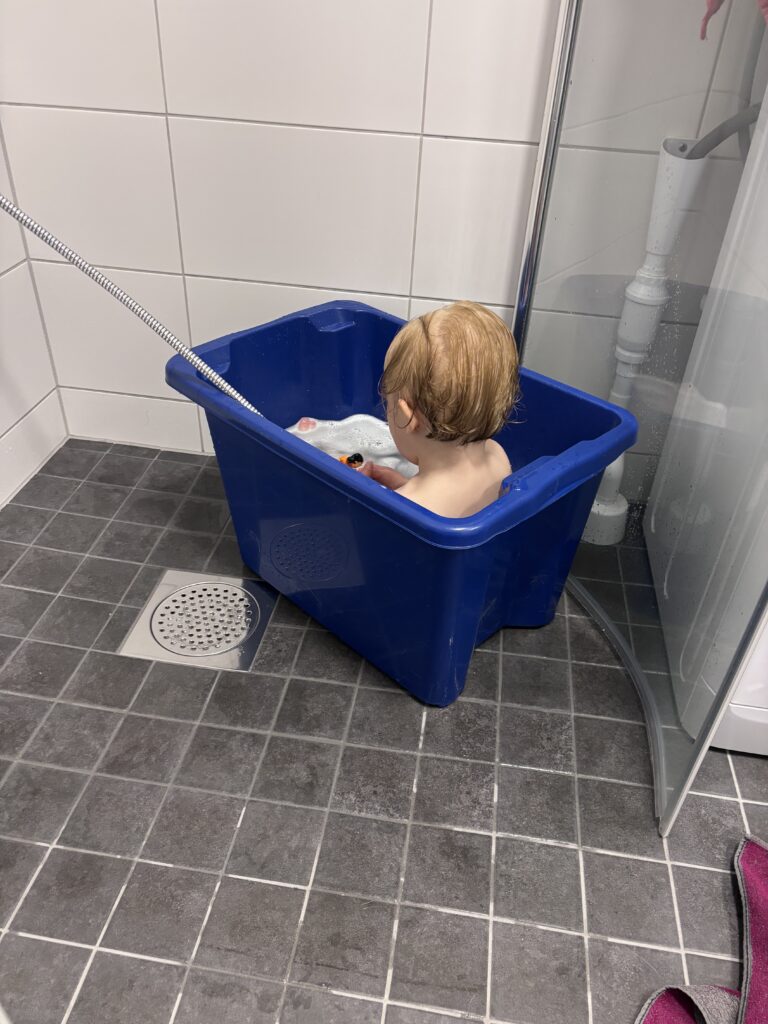 Så kunde jag, som jag eftersträvat sedan jag flyttade hit, hämta Ylva Lo på förskolan. Vi hann umgås här hemma ett tag och föräldrarna tog sig hit utan barnhämtning. Viktor rastade Bianca och fortsatte sedan på nya ”äventyr”, Elin kom och vi åt middag tillsammans. Vi umgicks en stund och avslutade med ett bad i ”mormors badkar”. Därefter kunde Ylva Lo somna under cykelfärden hem om hon ville.