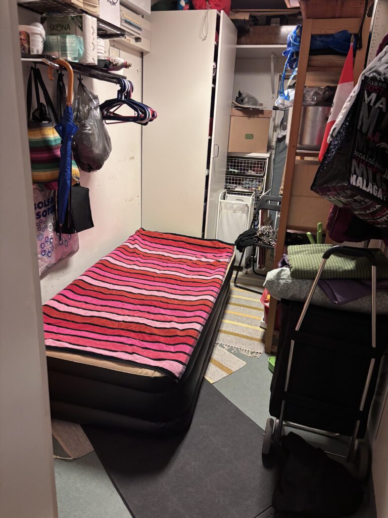 Vi gjorde en tidig kväll. Med ett par extra madrasser fick vi alla sovplatser. Karin sov i sitt förråd.