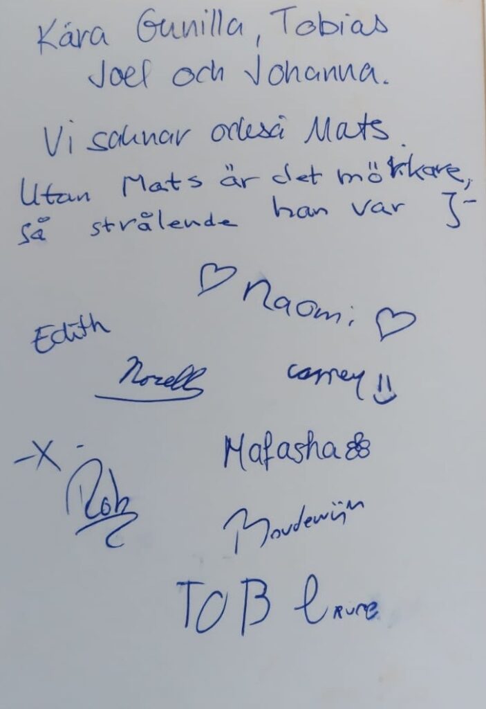 Några dagar innan Mats somnade in, hade vi ett samtal, hörde att det var inte samma Mats, Mats ville så gärna få vara med Gunilla, sista sommaren i Skåne,hade en stor rädsla och ångest, ville leva och vara med familjen. Mats hade ett stort hjärta för Gunilla och sönerna och hundarna och även få komma upp till Norrland och Höga kusten och även ner till Skåne.