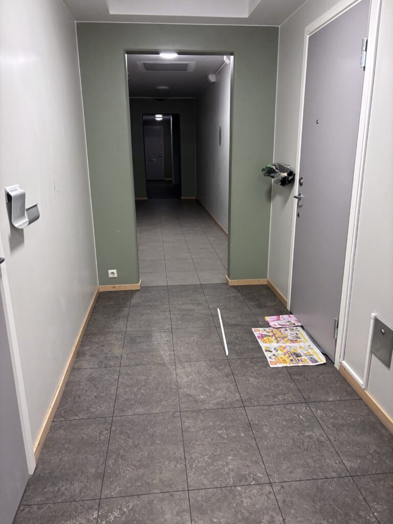 Min dörr är snett mitt emot och Bianca är lite svår att styra när hon väntar på att jag ska låsa upp dörren. Men vi försöker hålla oss utanför ”strecket”. Likaså kollar jag av korridoren innan jag öppnar dörren och går ut.