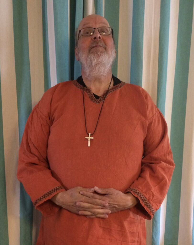 Augusti 2017 Mats poserar i en vacker skjorta som Johanna sytt åt honom.