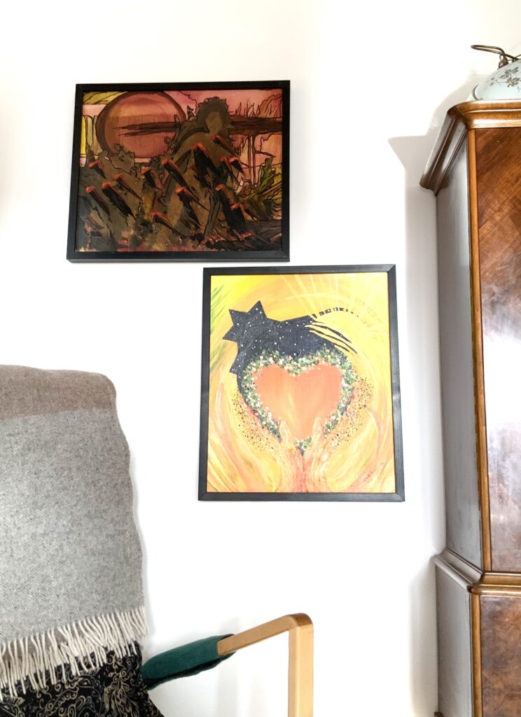 Den översta tavlan målade jag i ett försök att skildra min sorg när mamma och pappa hade dött. Jag har hängt den i mitt vardagsrum. Johanna reagerade och tycker att den är otäck och det är den, sorgen kan vara otäck och obekväm och just nu behöver jag just den tavlan!