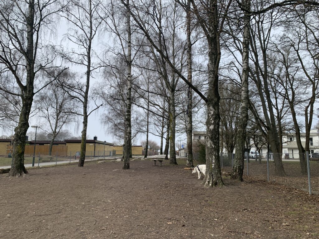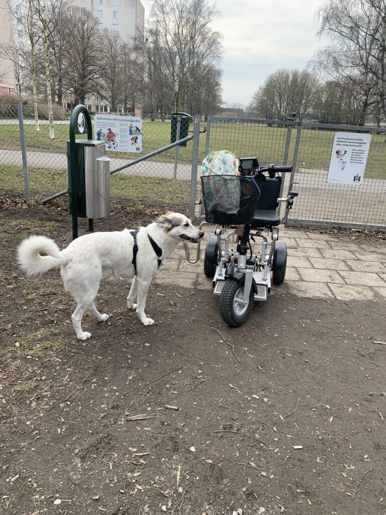 Bianca och jag tar nu dagliga utflyter med scootern, vilket hon gillar. Hon skrinnar på i mycket högre promenadtakt än jag kan åstadkomma. Dessutom kan hon springa fritt i hundrastgårdarna, vi har flera att välja på här i närheten.