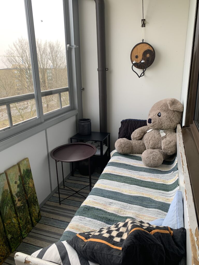 Igår tittade jag på skidtävlingar och slutförde många påbörjade projekt, bl a stryka gardiner och montera balkongbord. Balkongen väntar nu på en upphängning av Leo Sjöboms skepptavla, en smal hög hylla för växter (bakom nallen) och växter, växter, växter… Balkongen är inte stor men jag tror ändå att det kommer att bli mysigt att vistas där!