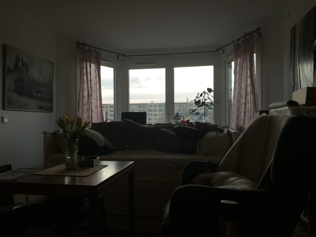 Nu har jag precis svalt morgonkaffet och hunnit kura gryning. Jag startar morgonen med en snabb rastning av Bianca, oftast före klockan 6, då vi försöker undvika alla kaniner som lurar i mörkret. Därefter gör jag frukost och sätter mig i fåtöljen för att vakna långsamt till gryningsljuset och lite surfande på paddan.